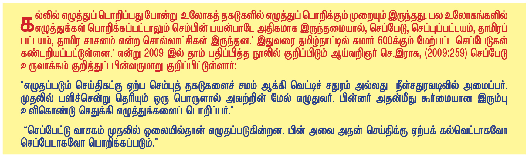 ‘25×15. செ.மீ. அளவுள்ள இச்செப்பேட்டில் முன்புறம் 46 வரிகளும் பின்புறம் 33 வரிகளுமாக 79 வரிகளில் வாசகம் பொறிக்கப்பட்டுள்ளது. மெய்யெழுத்துக்குப் புள்ளியிடுவதோடு மேலும் சில இடங்களில் வாசகங்களைப் பிரித்துப் படிப்பதறகாகவும் 3, 4 புள்ளிகள் இடப்பட்டுள்ளன.’