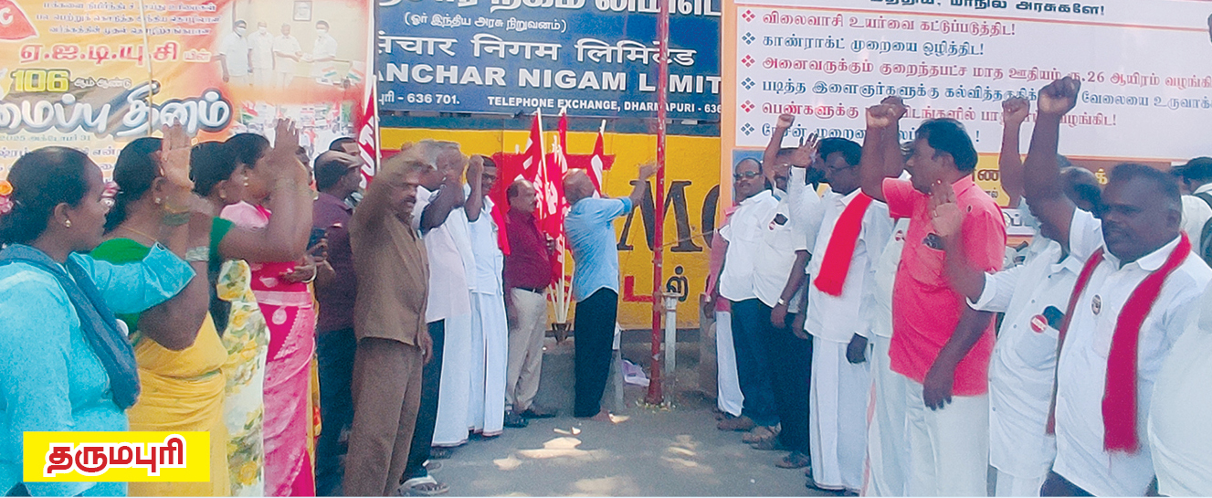 தருமபுரி: தருமபுரி தொலைபேசி நிலையம் அருகில், ஏஐடியூசி மாவட்ட துணைத் தலைவர் ஆர்.சுதர்சனன் சங்கக் கொடியை ஏற்றினார். இதில் ஏஐடியூசி மாவட்டப் பொதுச் செயலாளர் கே.மணி, கட்சியின் மாவட்டக் குழு உறுப்பினர்கள் எஸ்.சின்னசாமி, எம்.மாதேஸ்வரன், இண்டூர் வட்டாரச் செயலாளர் மாது, போக்குவரத்து மண்டலப் பொதுச் செயலாளர் சி.நாகராசன், உள்ளாட்சிப் பணியாளர் சங்க மாவட்ட தலைவர் மனோகரன், தூய்மைப் பணியாளர் சங்க மாவட்டச் செயலாளர் செல்வி, கட்டடச் சங்க விஜயா, ஏஐஒய்எப் எம்.நவீன்குமார், ஒடுக்கப்பட்டோர் சுப்ரமணி, ஆஷா சங்க மாவட்டச் செயலாளர் எஸ்.மேனகா, என்எப்டிஇ முனியன் உள்ளிட்டோர் கலந்து கொண்டனர்.