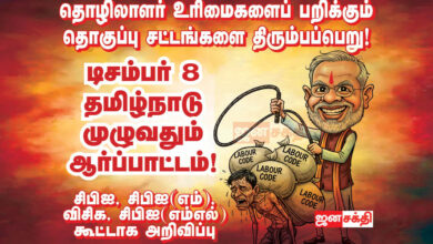 தொழிலாளர் உரிமைகளைப் பறிக்கும் தொகுப்பு சட்டங்களை திரும்பப் பெற வலியுறுத்தி டிசம்பர் 8 அன்று தமிழ்நாடு முழுவதும் இந்திய கம்யூனிஸ்ட் கட்சி,…