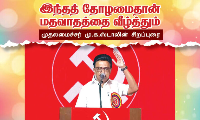 திராவிட இயக்கத்திற்கும் – பொதுவுடைமை இயக்கத்திற்கும் இலக்கு ஒன்றுதான்! எல்லோருக்கும் எல்லாம் கிடைக்க வேண்டும் என்பதுதான் நம்முடைய ஒற்றை இலக்கு! அதனால்தான், திராவிட இயக்கக் கொடிகளில் சிவப்பு இருக்கிறது! திராவிட முன்னேற்றக் கழக கொடியிலும் சரிபாதியாக சிவப்பு இருக்கிறது! நம்முடைய கொள்கைகளில் – அரசியல் வழிமுறைகளில் – சிறு சிறு வேறுபாடுகள் இருந்தாலும், நம்முடைய பொது இலக்கு சமத்துவச் சமுதாயம்தான்!