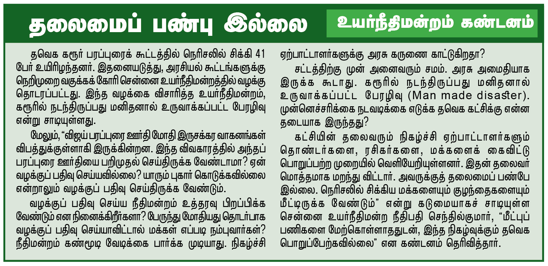 இவை அனைத்தும் நாகப்பட்டினத்தில் விஜய் பேசியவை. இவற்றில் என்ன அரசியல் பார்வை இருக்கிறது? தவெக தொண்டர்களின் ரசிக மனநிலையை அரசியல்படுத்தும் வகையில் இல்லாமல் இருப்பது ஏன்? மாறாக, காவல்துறையும் நீதிமன்றமும் தவெக கூட்டங்களுக்கு விதிக்கும் கட்டுப்பாடுகளுக்கு எதிராக எந்தப் பொறுப்புணர்வும் இன்றி எகத்தாளமாகவும் எதிர்ப்பாகவும் தொண்டர்களைத் தூண்டிவிடும் பேச்சாகும்.