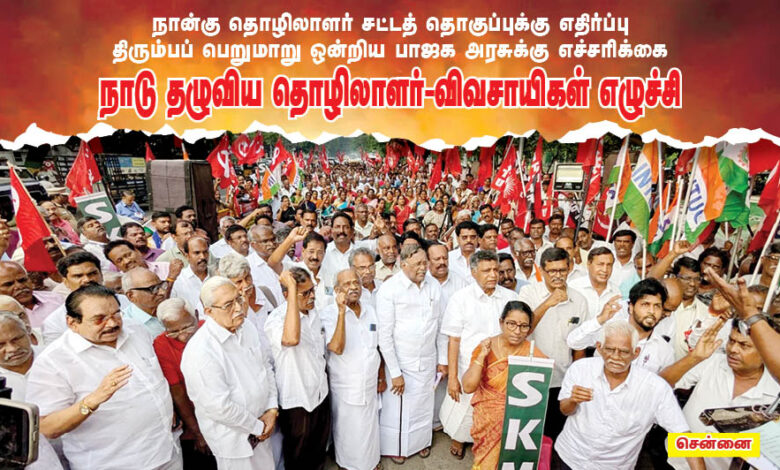 ஒன்றிய மோடி அரசின் நான்கு தொழிலாளர் சட்டத் தொகுப்புகள் மற்றும் விவசாயிகளுக்கு எதிரான கருப்புச் சட்டங்களுக்கு எதிராக தொழிலாளர்களும் விவசாயிகளும் நாடு தழுவிய கிளர்ச்சியில் ஈடுபட்டனர்.