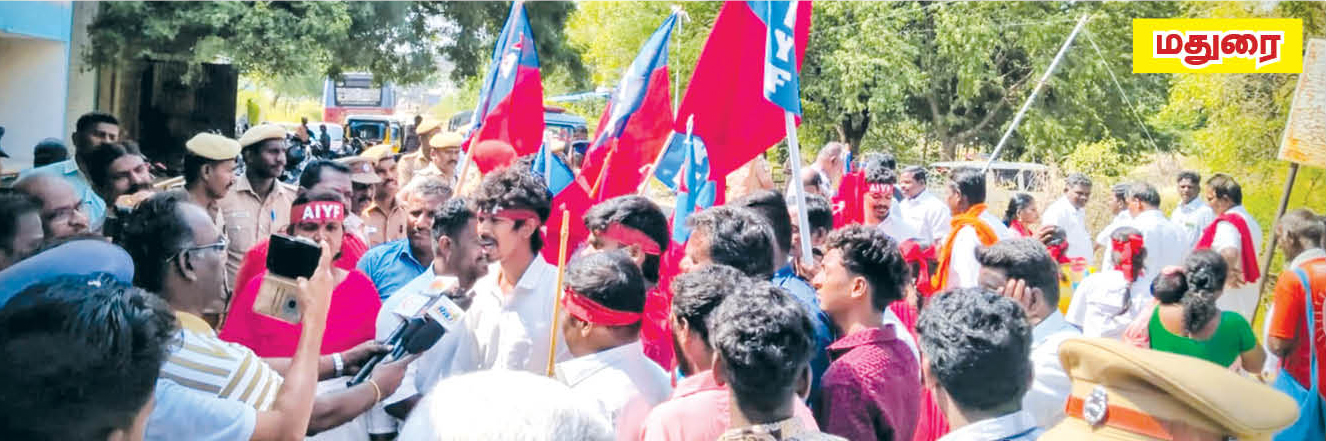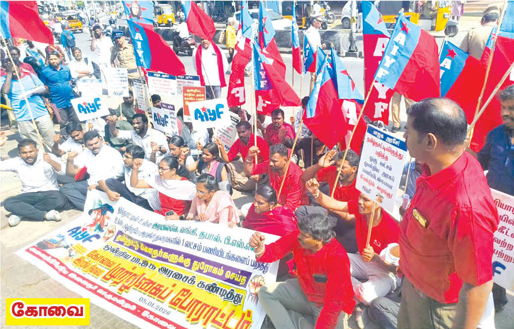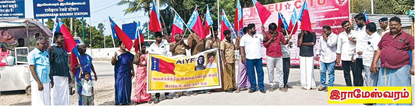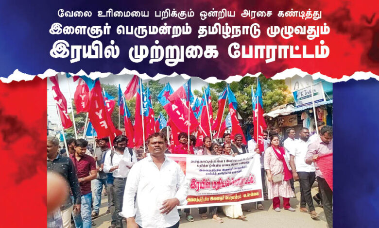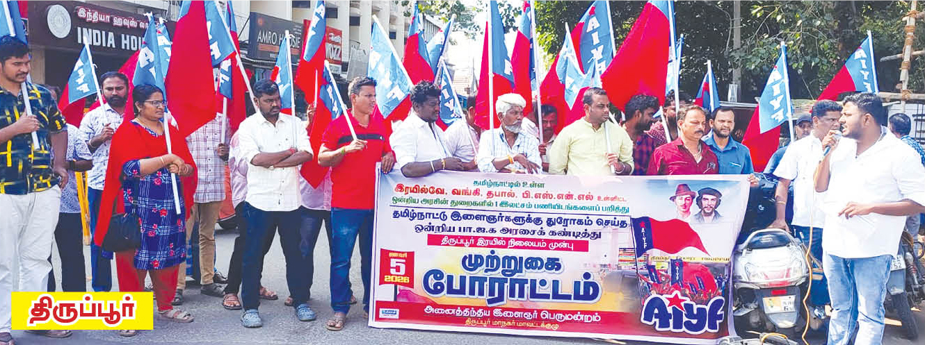 தமிழ்நாட்டில் உள்ள இரயில்வே, வங்கி, இன்சூரன்ஸ், பிஎஸ்என்எல் உள்ளிட்ட ஒன்றிய அரசு மற்றும் பொதுத்துறை நிறுவனங்களில் 1 லட்சம் இடங்களை பறித்து, தமிழ்நாட்டு இளைஞர்களுக்கு துரோகம் செய்யும் ஒன்றிய அரசை கண்டித்தும் தமிழ்நாட்டில் உள்ள ஒன்றிய அரசு மற்றும் பொதுத்துறை நிறுவனங்களில் தமிழ்நாட்டு இளைஞர்களுக்கு முன்னுரிமை வழங்க வலியுறுத்தியும், இரயில்வே, வங்கி, தனியார்துறையில் இடஒதுக்கீட்டை அமல்படுத்த சட்டம் நிறைவேற்று, பொத்துறை நிறுவனங்களை விற்காதே, ஒன்றிய மற்றும் மாநில அரசுக்காலிப் பணியிடங்களை உடனே நிரப்பு, முதலாளிக்கு ஆதரவான புதிய தொழிலாளர் சட்டங்களை திரும்பப்பெறு, ஒப்பந்த மற்றும் அவுட்சோர்சிங் முறையை ரத்து செய் என்பன உள்ளிட்ட கோரிக்கைகளை வலியுறுத்தி, தமிழ்நாடு முழுவதும் அனைத்திந்திய இளைஞர் பெருமன்றம் சார்பில், 5.1.2026 அன்று ரயில் நிலையங்களை முற்றுகையிடும் போராட்டம் நடைபெற்றது. இதில் பங்கேற்ற ஏராளமான இளைஞர்கள் கைது செய்யப்பட்டனர்.