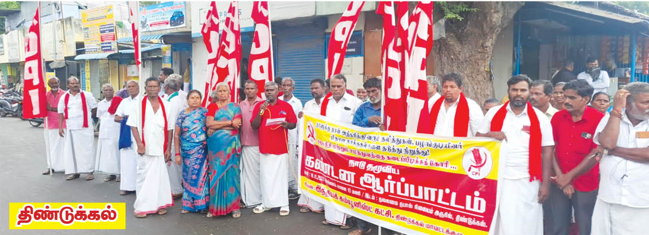 திண்டுக்கல்: திண்டுக்கல் மாவட்டம் பி.கிருஷ்ணசாமி மாநகரச் செயலாளர் தலைமையில் ஆர்ப்பாட்டம் நடைபெற்றது. ஏ.பி.மணிகண்டன் மாவட்டச் செயலாளர் சிறப்புரை நிகழ்த்தினார். மாவட்டக் குழு உறுப்பினர் ராஜாமணி, நத்தம் ஒன்றியச் செயலாளர் பி.வெள்ளைச்சாமி, இந்திய தேசிய மாதர் சம்மேளன மாவட்டச் செயலாளர் சாந்தி, ஏஐடியுசி கௌரவத் தலைவர் சந்திரமோகன், ஏஐடியுசி போக்குவரத்து மாவட்டச் செயலாளர் பாஸ்கரன் ஆகியோர் கண்டன உரை நிகழ்த்தினர். மாநகர துணைச் செயலாளர் சுப்பிரமணி நன்றி கூறினார்.