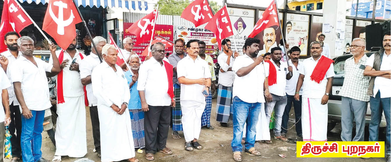 திருச்சி புறநகர்: திருச்சி புறநகர் மாவட்டம் சார்பில் நெ.1.டோல்கேட் பேருந்து நிலையம் முன்பு ஆர்ப்பாட்டம் நடைபெற்றது. ஆர்ப்பாட்டத்திற்கு மாவட்ட துணைச் செயலாளர் அண்ணாதுரை தலைமை வகித்தார். மண்ணச்சநல்லூர் ஒன்றியச் செயலாளர் கருணாநிதி, இலால்குடி ஒன்றியச் செயலாளர் சப்தரிஷி, இலால்குடி நகரச் செயலாளர் குணா ஆகியோர் முன்னிலை வகித்தனர். தமிழ்நாடு விவசாயிகள் சங்க மாநில துணைச் செயலாளர் இந்திரஜித் சி.பி.ஐ புறநகர் மாவட்டச் செயலாளர் ராஜ்குமார் முன்னாள் மாநிலக் குழு உறுப்பினர் செல்வராஜ் தமிழ்நாடு விவசாயிகள் சங்க மாவட்டச் செயலாளர் பழனிச்சாமி ஆகியோர் உரை நிகழ்த்தினர். மாவட்டப் பொருளாளர் ஜனசக்தி உசேன் நன்றி கூறினார்.