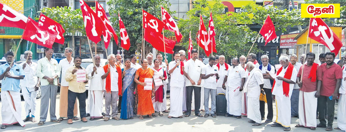 தேனி: தேனி மாவட்டத்தில் பழைய பேருந்து நிலையம் அருகில் தேனி தாலுகா செயலாளர் பி.மொக்க மாயன் தலைமையில் ஆர்ப்பாட்டம் நடைபெற்றது. மாவட்டக் குழு உறுப்பினர் எம்.வி.கல்யாண சுந்தரம் முன்னிலை வகித்தார். மாவட்டக் குழு உறுப்பினர் எஸ்.திருமலை கொழுந்து ஆர்ப்பாட்டத்தை விளக்கிப் பேசினார். மாவட்டச் செயலாளர் கி.பெருமாள் ஆர்ப்பாட்டத்தை நிறைவுரை ஆற்றினார்.