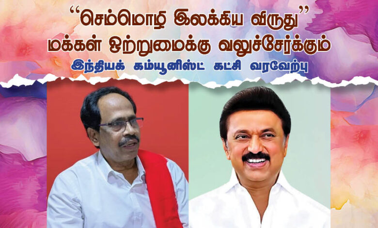 தமிழ்நாடு அரசு அறிவித்துள்ள “செம்மொழி இலக்கிய விருது” மக்கள் ஒற்றுமைக்கு வலுச்சேர்க்கும் என்று இந்தியக் கம்யூனிஸ்ட் கட்சி வரவேற்பு தெரிவித்துள்ளது. இது குறித்து கட்சியின் மாநிலச் செயலாளர் மு.வீரபாண்டியின் வெளியிட்டுள்ள அறிக்கையில் கூறியிருப்பதாவது: