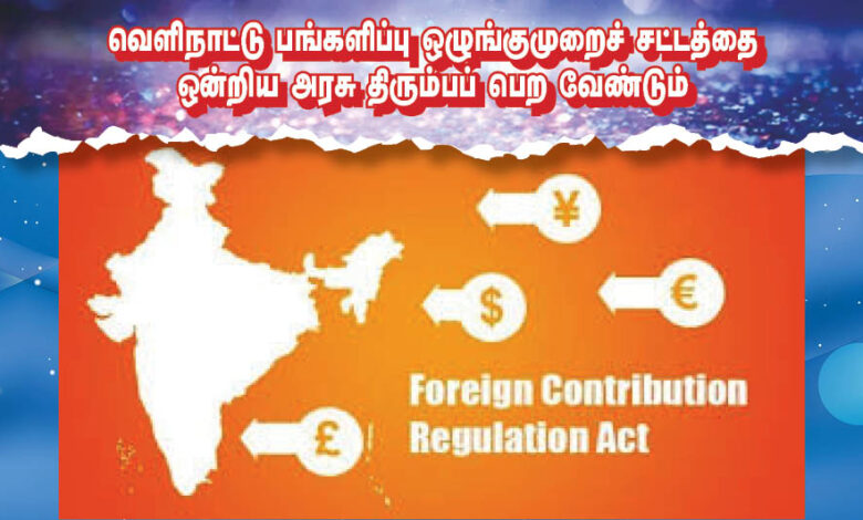 வெளிநாட்டு பங்களிப்பு ஒழுங்குமுறைச் சட்டத்தை ஒன்றிய அரசு திரும்பப் பெற வேண்டும்