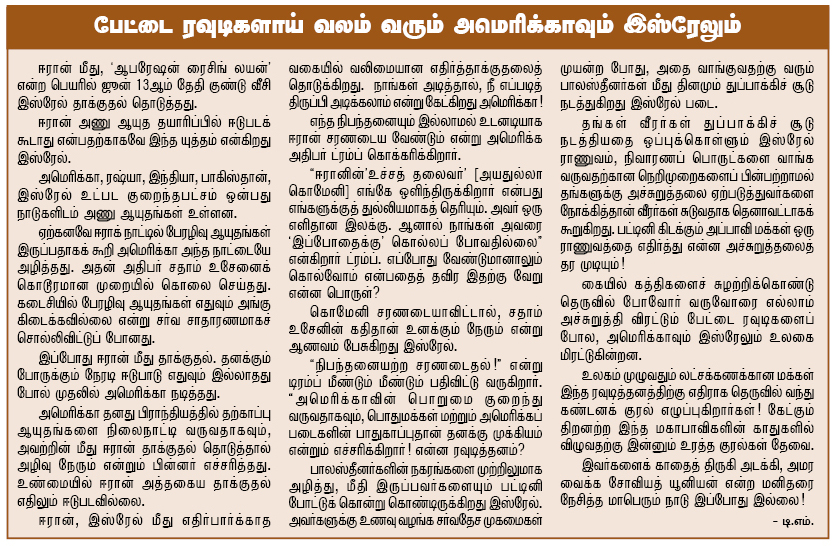 ஜி7 நாடுகளின் கூட்டம் கனடாவில் நடைபெற்றது. இதனைப் பாதியிலேயே முடித்துக்கொண்டு ஈரான் மீது எச்சரிக்கை விடுத்தபடி அமெரிக்க அதிபர் வெளியேறிவிட்டார். அத்தோடு ஈரான் தலைநகர் டெஹ்ரான் மக்களை ட்ரம்ப் வெளியேறச் சொல்கிறார். அதாவது மிரட்டுகிறார். மத்திய கிழக்கில் ராணுவக் கப்பல்களை அமெரிக்கா, இங்கிலாந்து நிறுத்தி உள்ளது. எந்த நேரத்திலும் அமெரிக்கா ஈரானைத் தாக்கக்கூடும்.
